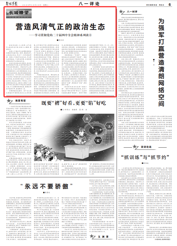 政治生態(tài)是政治生活現(xiàn)狀、政治發(fā)展環(huán)境的集中反映,是各種要素相互作用形成的有機(jī)整體。營(yíng)造風(fēng)清氣正的政治生態(tài),不僅關(guān)系到全面深化改革各項(xiàng)舉措的落實(shí),關(guān)系到強(qiáng)國(guó)建設(shè)、民族復(fù)興偉業(yè)的實(shí)現(xiàn),更會(huì)影響到黨和國(guó)家的長(zhǎng)治久安。對(duì)于軍隊(duì)而言,貫徹落實(shí)習(xí)主席關(guān)于營(yíng)造風(fēng)清氣正政治生態(tài)的指示要求,就是要努力營(yíng)造一個(gè)良好從政環(huán)境,形成政治清明、干部清正、軍營(yíng)清朗的政治生態(tài),從根本上確保廣大黨員干部尤其是領(lǐng)導(dǎo)干部走務(wù)實(shí)清廉的正道,不入奢靡貪腐的歧途,聚精會(huì)神奮斗建軍百年,奮進(jìn)強(qiáng)軍一流。