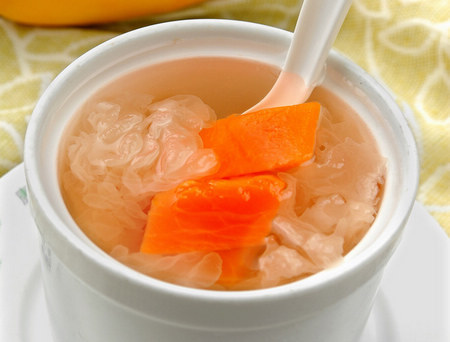 準備材料:木瓜1個、銀耳25克、北杏15克、南杏20克,冰糖適量。