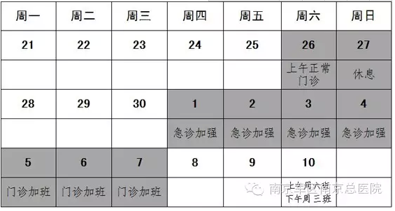 2、國(guó)慶節(jié)10月1日(周四)至7日(周三),全院放假7天。其中1日至4日上午急診加強(qiáng),5日至7日上午門診加班。10月10日全天上班,門診上午上周六班,下午上周三班。