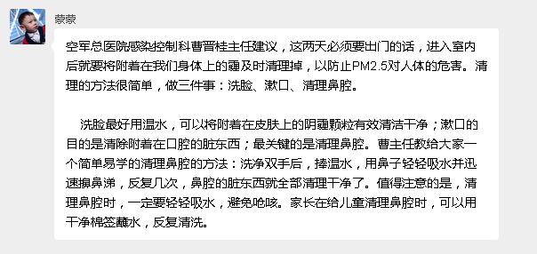 今天,一條消息在微信圈瘋傳,空軍總醫(yī)院感染控制科主任曹晉桂針對霧霾天為大家提的建議:“霧霾回家三件事,洗臉、漱口、清理鼻腔”。于是,很對媒體朋友紛紛打來電話詢問:曹晉桂是空軍總醫(yī)院感染控制科主任嗎?這條微信是不是網(wǎng)絡(luò)騙局?在此給大家發(fā)一張截圖,小伙伴們是不是都看到啦?是不是還將信將疑呢?