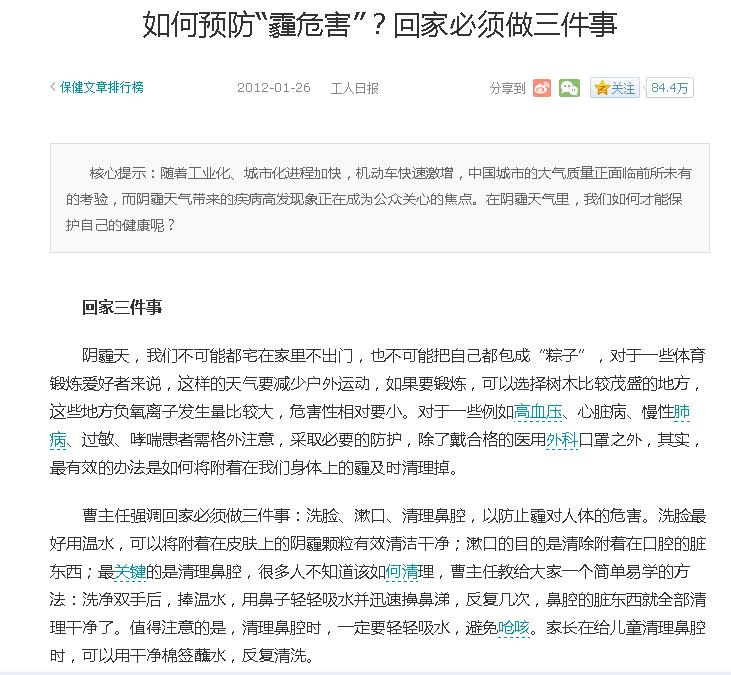 事實上,曹晉桂確實是空軍總醫(yī)院感染控制科主任,我國知名感染控制專家。他針對霧霾天曾提出:“霧霾天回家要做三件事,洗臉、漱口、清理鼻腔”,該提法最早是他于2013年1月,在《工人日報》刊文“霧霾天回家需要做好三件事:洗臉、漱口、清理鼻腔”文章中提出來的,這是新聞稿件截圖,當(dāng)時也在網(wǎng)絡(luò)上瘋傳。曹主任推薦的辦法,對咱老百姓都是有用的,可以照著去做。