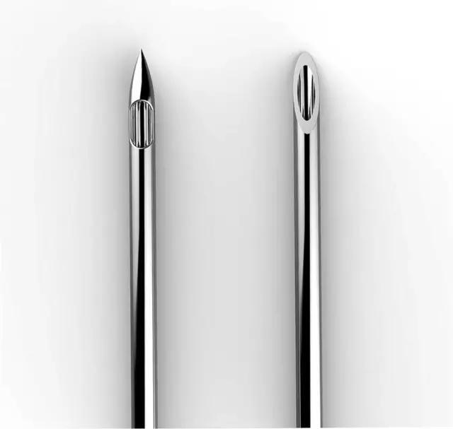圖 2 為微創(chuàng)針的「精準(zhǔn)」針尖(左)和創(chuàng)傷性的「切割」針尖(右)。