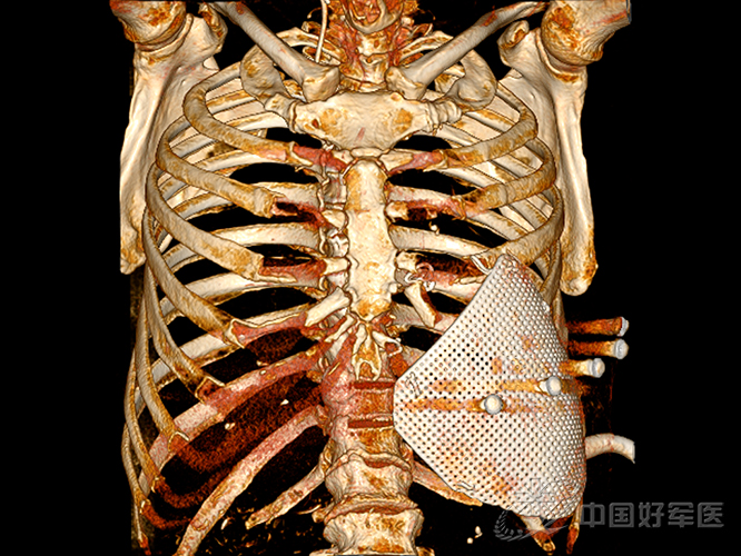 裝置3D適形鈦板胸壁成形術(shù)后的CT三維重建圖像