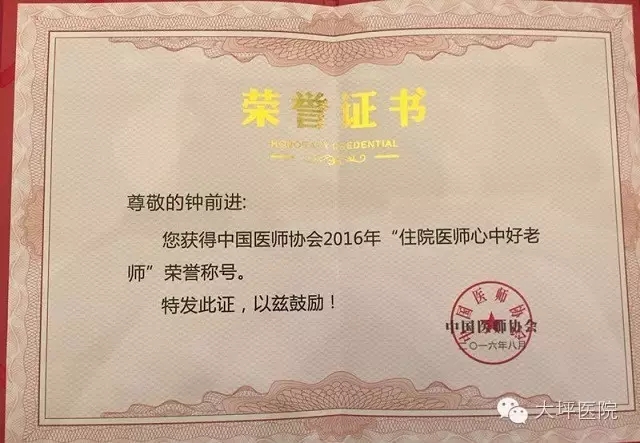 2016年8月27日,在北京舉行的2016年住院醫(yī)師規(guī)范化培訓(xùn)高峰論壇會(huì)上,大坪醫(yī)院心血管外科鐘前進(jìn)主任獲評(píng)中國(guó)醫(yī)師協(xié)會(huì)“住院醫(yī)師心中好老師”稱號(hào),也是第三軍醫(yī)大學(xué)獲得此榮譽(yù)第一人。住院醫(yī)師心中好老師獎(jiǎng)是對(duì)鐘前進(jìn)主任熱愛(ài)醫(yī)學(xué)教育工作的獎(jiǎng)勵(lì),更是對(duì)我院住院醫(yī)師規(guī)范化培訓(xùn)教學(xué)水平、教學(xué)質(zhì)量的肯定。