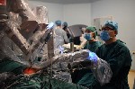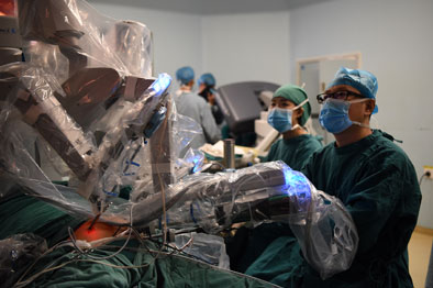 兩名醫(yī)生在協(xié)助達芬奇手術機器人進行全結腸切除手術
