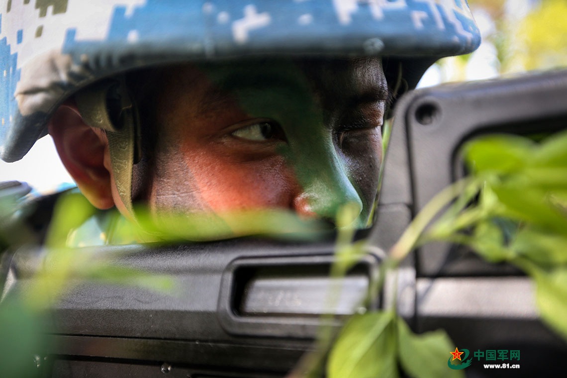 擔任掩護任務(wù)的陳琪班長正警戒巡視前方。