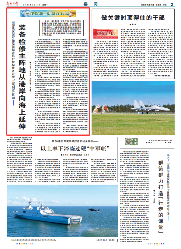 編者按 習(xí)主席指出,要“教育引導(dǎo)官兵大膽操作和使用裝備,真正讓裝備活起來、動起來,在體系運用中檢驗性能、發(fā)掘潛能,推動新裝備成建制成體系形成作戰(zhàn)能力和保障能力”。東部戰(zhàn)區(qū)海軍保障部探索創(chuàng)新的艦艇裝備管理“五項制度”,著力破解艦艇長時間遠(yuǎn)海航行條件下裝備檢修保養(yǎng)難的問題,推動裝備檢修從港岸走向遠(yuǎn)海大洋,有效提升了裝備保障能力,為部隊?wèi)?zhàn)斗力建設(shè)打下堅實基礎(chǔ)。