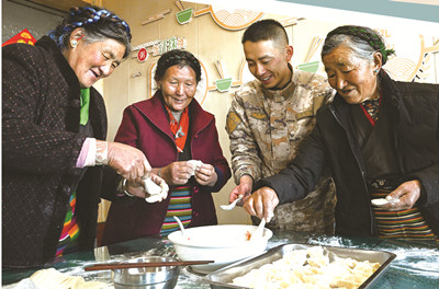 官兵們圍坐在阿媽身邊,你一言我一語說著曾經(jīng)的趣事,歡笑聲回蕩在哨所里,溫暖了雪山的寒意。