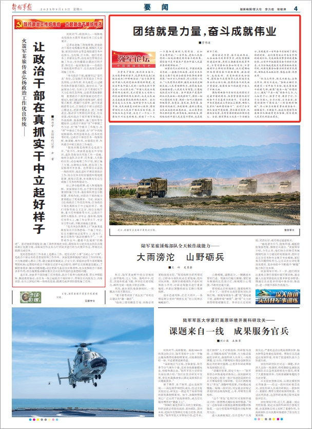 “積力之所舉,則無不勝也;眾智之所為,則無不成也?!备骷墤^定實現(xiàn)建軍一百年奮斗目標,鼓足團結(jié)奮斗的精氣神,凝聚“想在一起”的團結(jié)之心,激發(fā)“干在一起”的奮斗之力,人人知責于心、擔責于身、履責于行,個個全力投入、全力以赴、全力出擊,在黨的旗幟下團結(jié)成“一塊堅硬的鋼鐵”,齊心協(xié)力為強軍事業(yè)艱苦奮斗、頑強奮斗、不懈奮斗,把我們黨領導的英雄軍隊鍛造得更加堅強,續(xù)寫英雄人民軍隊的浴血榮光。