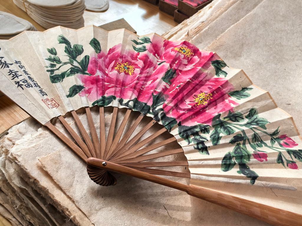 8月16日在新疆和田地區(qū)墨玉縣布達(dá)村桑皮紙產(chǎn)業(yè)園拍攝的桑皮紙扇。新華社記者 賀小童 攝