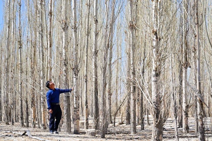 在新疆庫爾勒市成幫柳苗圃基地,義務(wù)植樹志愿者王成幫查看苗木長(zhǎng)勢(shì)(4月11日攝)。新華社記者丁磊攝