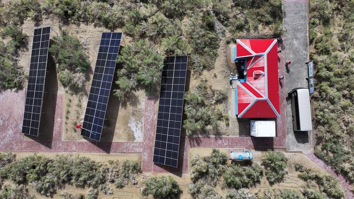 這是2023年8月20日拍攝的中國(guó)石油塔里木油田零碳沙漠公路光伏發(fā)電站。新華社記者顧煜攝