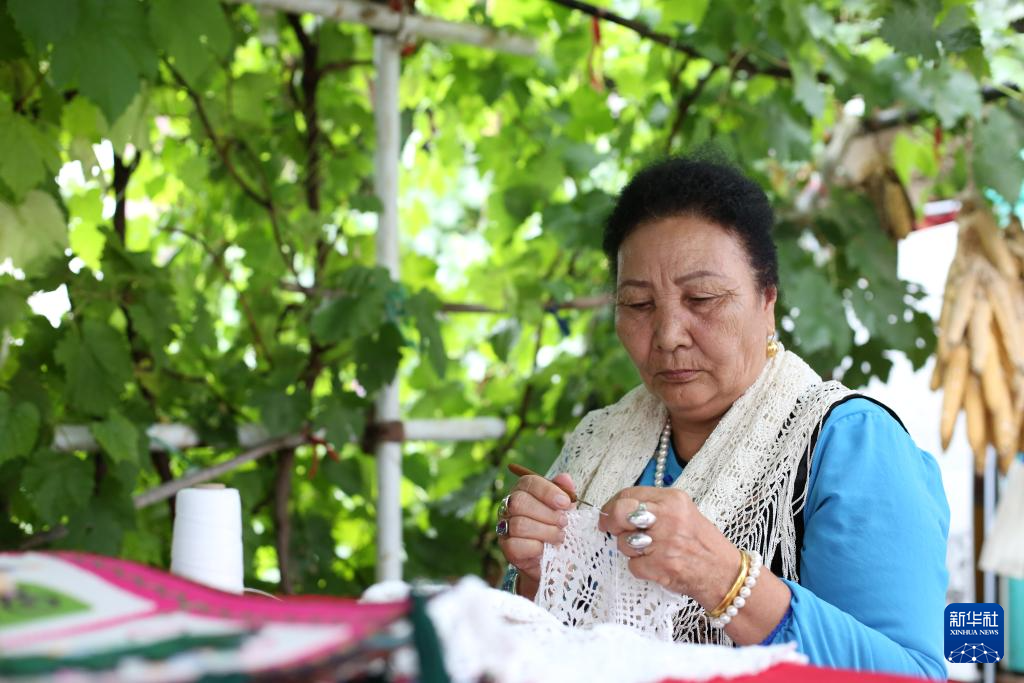9月9日,75歲的哈薩克族老人古麗塞肯·比達(dá)合買提在“戶兒家”文化大院編織。
