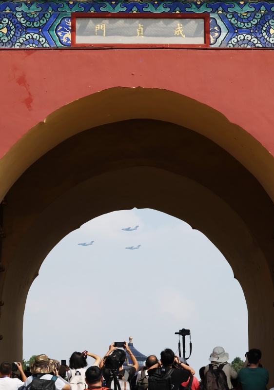 9月3日,紀念中國人民抗日戰(zhàn)爭暨世界反法西斯戰(zhàn)爭勝利80周年大會在北京隆重舉行。這是市民在北京天壇公園觀看運輸機梯隊。