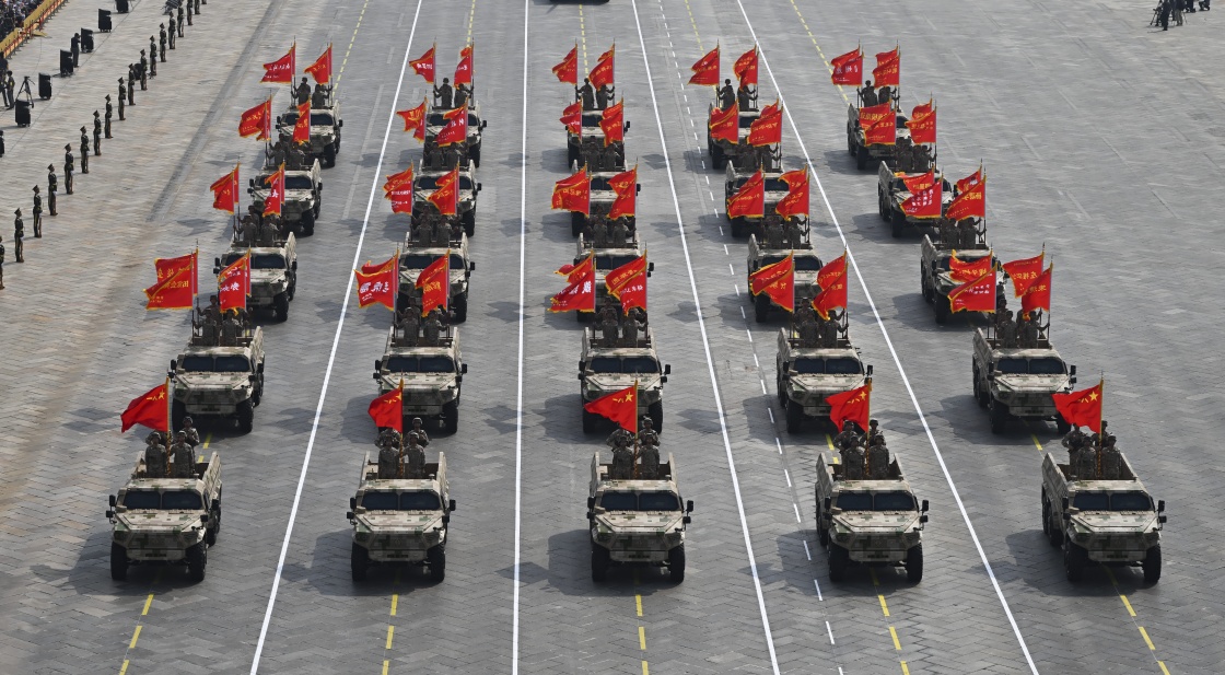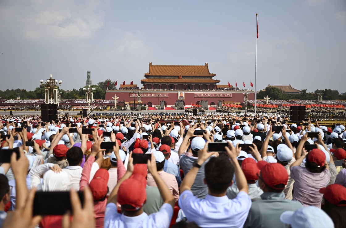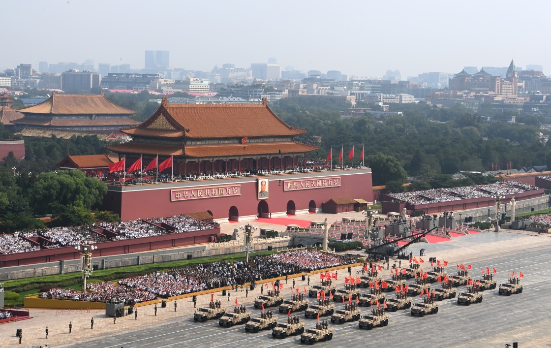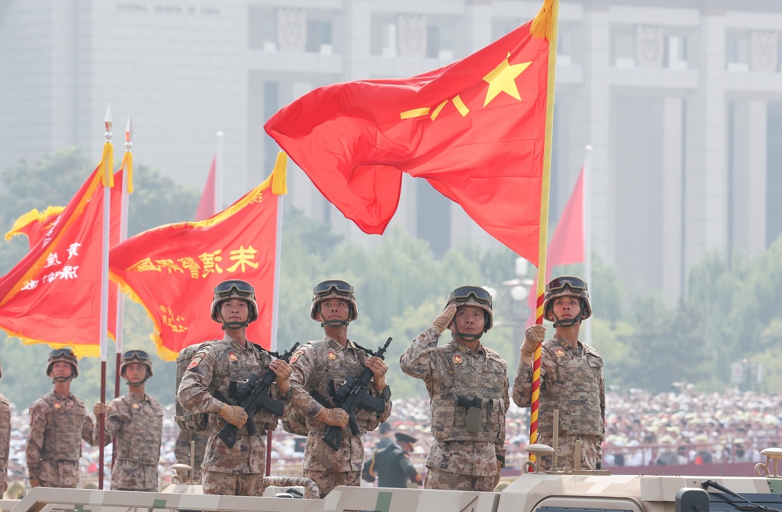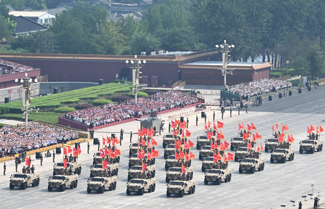9月3日,紀(jì)念中國(guó)人民抗日戰(zhàn)爭(zhēng)暨世界反法西斯戰(zhàn)爭(zhēng)勝利80周年大會(huì)在北京隆重舉行。這是戰(zhàn)旗方隊(duì)接受檢閱。