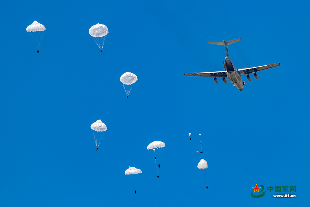 “常勝模范連”官兵執(zhí)行跳傘任務(wù)。