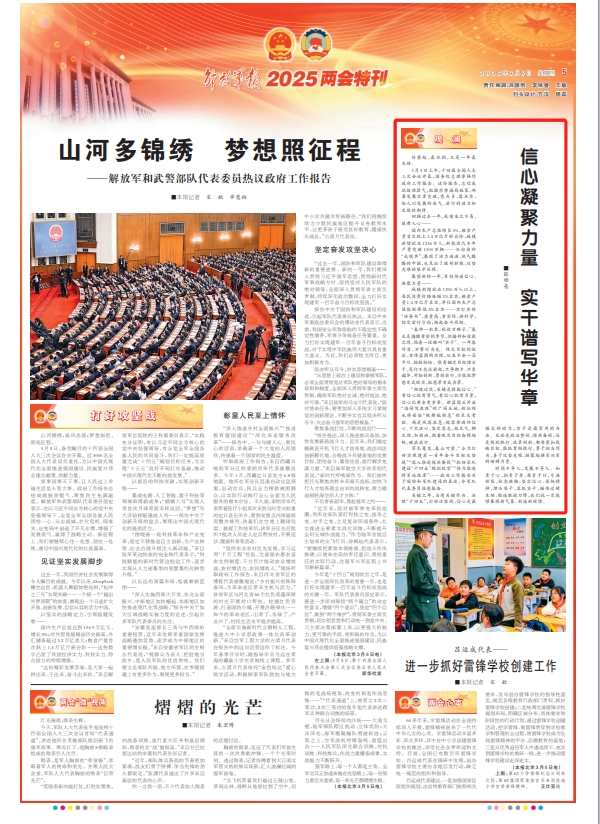 草木蔓發(fā),春山可望?!叭Υ蚝脤崿F(xiàn)建軍一百年奮斗目標(biāo)攻堅戰(zhàn)”“深入推進(jìn)練兵備戰(zhàn)”“抓好軍隊建設(shè)‘十四五’規(guī)劃收官”“協(xié)力推進(jìn)跨軍地改革”……政府工作報告關(guān)于國防和軍隊建設(shè)的表述,令軍隊代表委員倍感振奮。