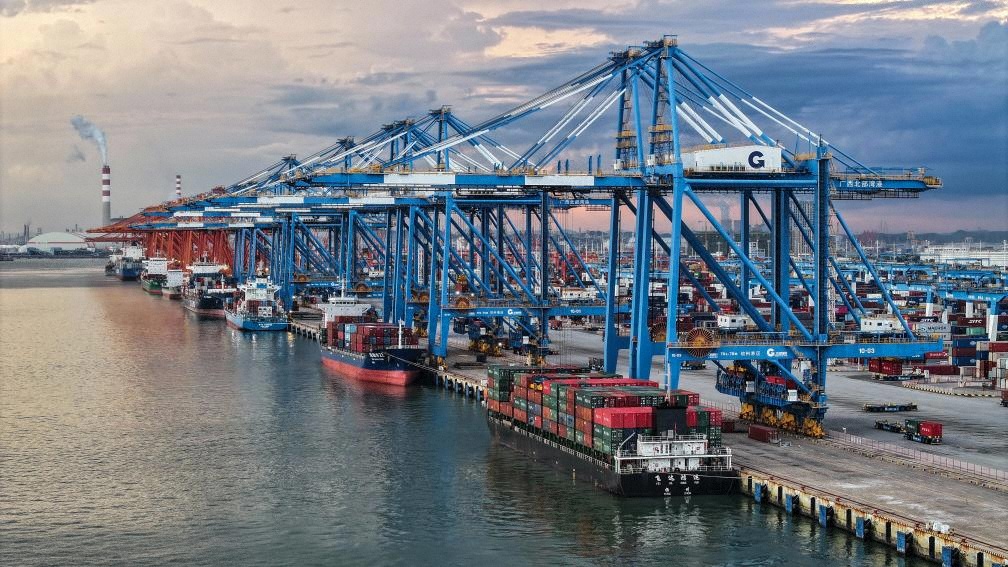 2025年9月16日,海輪在欽州港碼頭裝卸貨物(無人機(jī)照片)。新華社記者 張愛林 攝