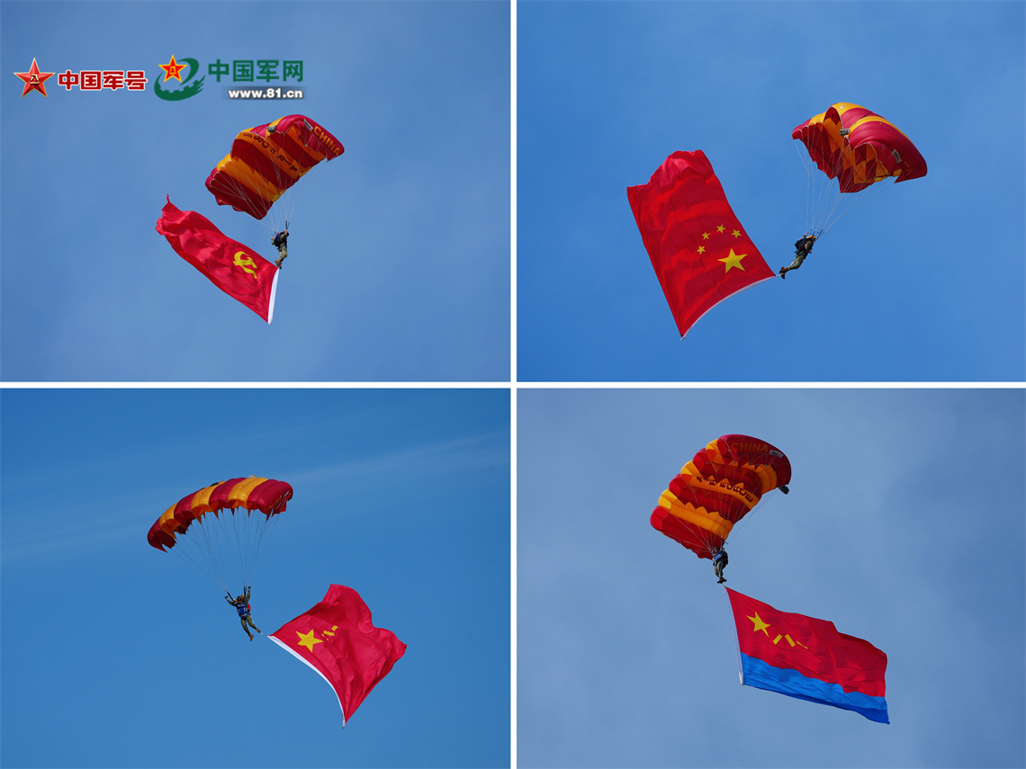 9月19日上午,第十一屆空軍航空開放活動和長春航空展在吉林長春開幕。這是跳傘隊攜帶黨旗、國旗、八一軍旗和空軍軍旗先后躍出機艙。中國軍網(wǎng)記者孫悅 攝