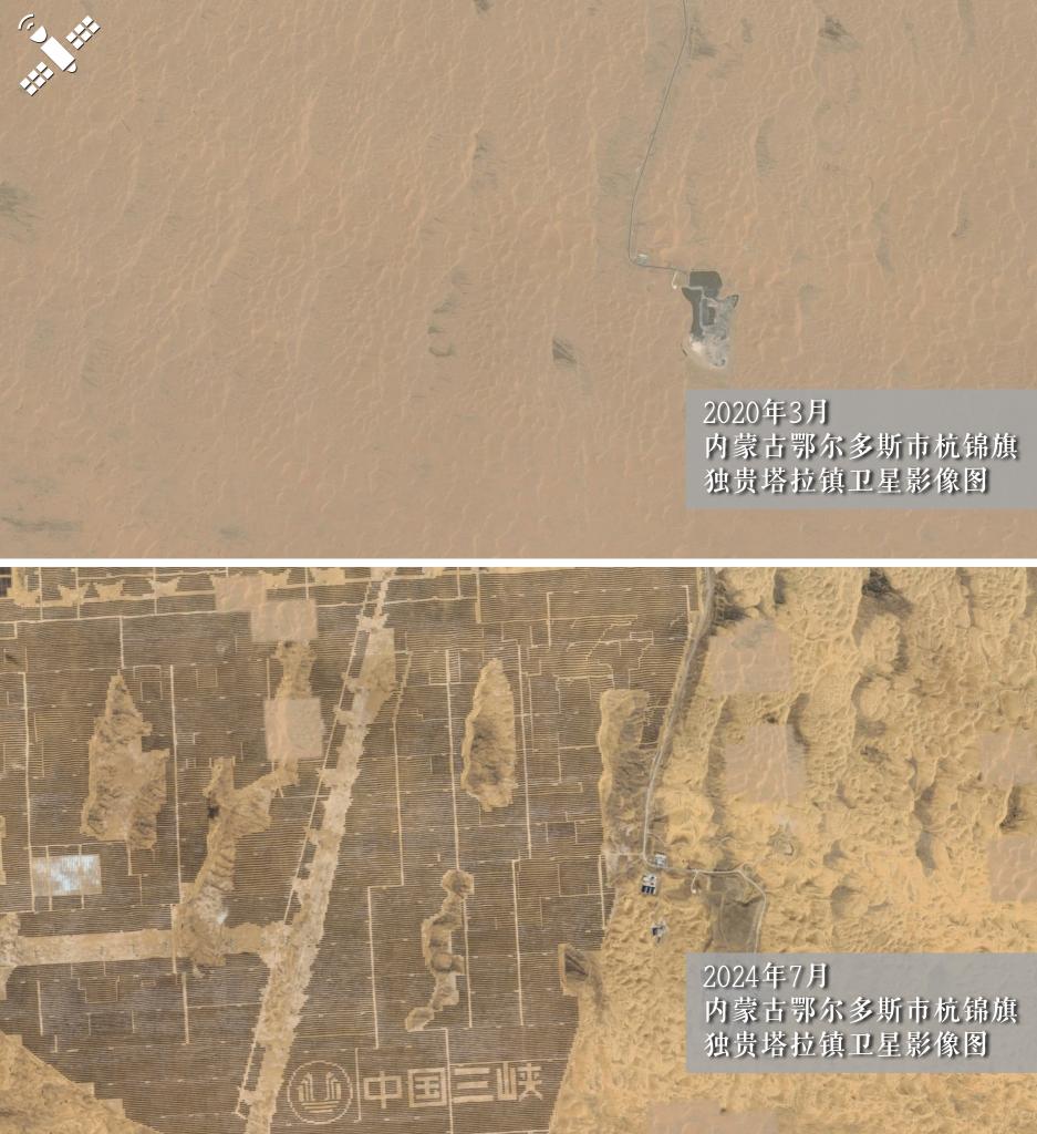 解讀:2020年沙丘裸露的荒漠(上圖)與2024年光伏治沙工程竣工后的同一區(qū)域(下圖)對(duì)比,荒漠已變生態(tài)屏障。