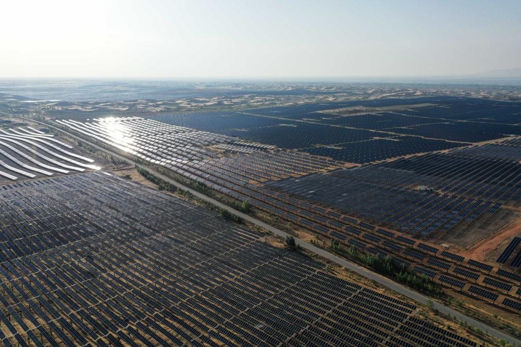 內(nèi)蒙古杭錦旗蒙西基地庫(kù)布其200萬(wàn)千瓦光伏治沙項(xiàng)目區(qū)(2024年6月5日攝)。