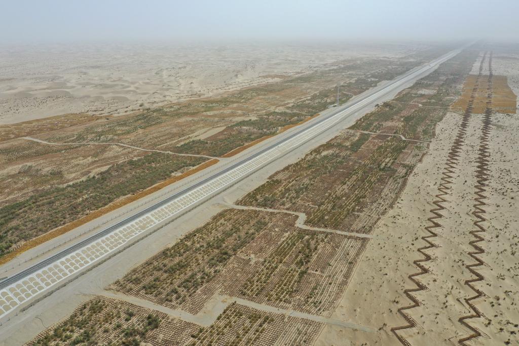 這是在和若鐵路沿線拍攝的蘆葦沙障、蘆葦方格和耐旱植物組成的防沙“三件套”(2022年5月19日攝)。