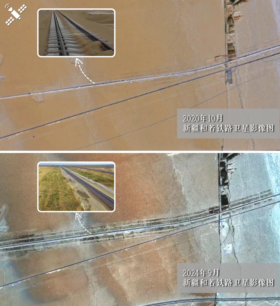 解讀:2020年黃沙漫道與2024年綠帶護(hù)路對(duì)比:和若鐵路沿線成功筑牢生態(tài)屏障。