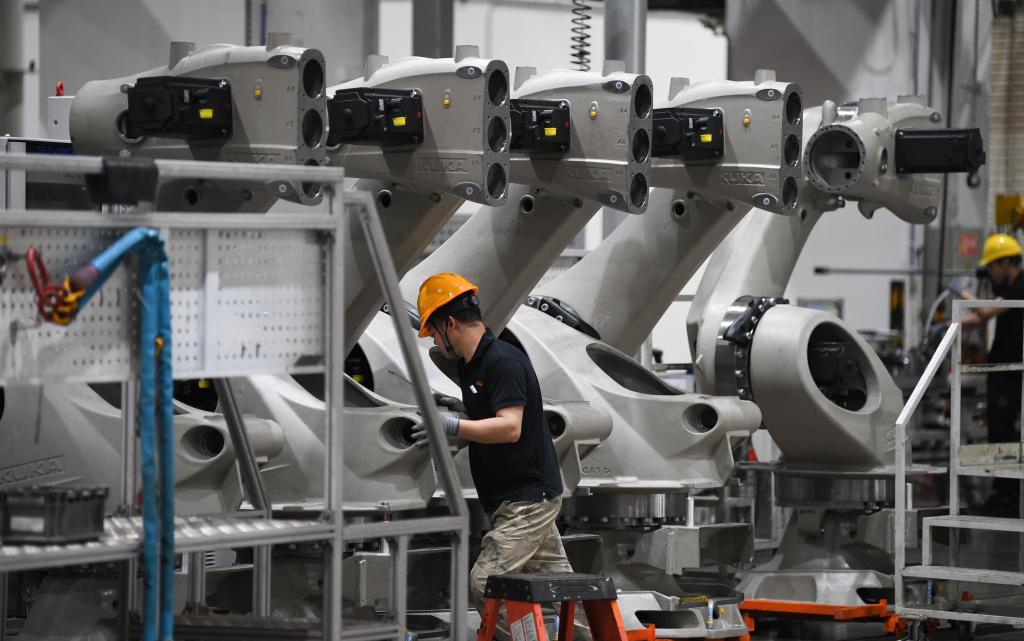 數(shù)據(jù)顯示,目前,我國(guó)制造業(yè)機(jī)器人密度達(dá)470臺(tái)/萬(wàn)人,遠(yuǎn)超全球平均水平。在廣東省佛山市美的庫(kù)卡智能制造科技園,有一條“機(jī)器人生產(chǎn)機(jī)器人”全自動(dòng)化生產(chǎn)線。整條生產(chǎn)線均由機(jī)器人組成,可全天24小時(shí)不間斷工作,平均30分鐘就能下線一臺(tái)機(jī)器人。