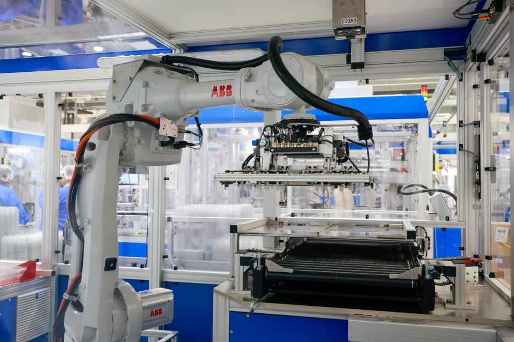 9月18日,在江蘇常州中瑞(常州)國際產(chǎn)業(yè)創(chuàng)新園,機(jī)械臂在醫(yī)沛生醫(yī)療器械制造(常州)有限公司生產(chǎn)車間作業(yè)。新華社記者 劉佳琪 攝