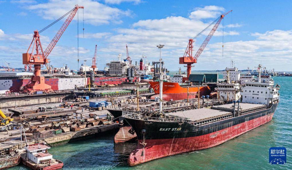 10月14日,在山東省榮成市石島管理區(qū)修造船產(chǎn)業(yè)基地,工人們?cè)诩泳o工作(無(wú)人機(jī)照片)。新華社發(fā)(李信君攝)
