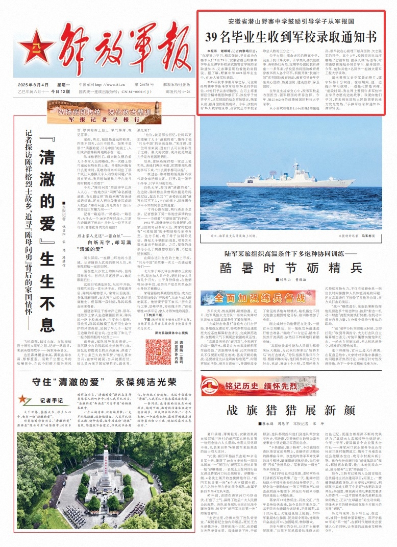 解放軍報(bào)訊 謝婷婷、記者向黎鳴報(bào)道:“你要努力學(xué)習(xí)、精武強(qiáng)能,早日成為合格軍人!”7月25日,安徽省潛山野寨中學(xué)畢業(yè)生譚宇軒收到武警警官學(xué)院的錄取通知書,父親譚亞明拍著他的肩膀說(shuō)。據(jù)了解,野寨中學(xué)2025屆畢業(yè)生中,有39人被軍校錄取。