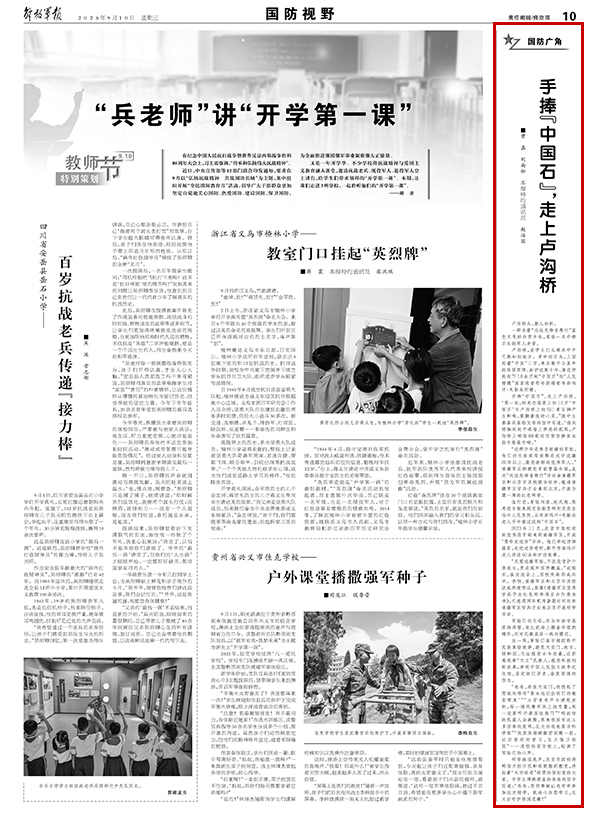 盧溝橋,是學(xué)生們從課本中早已熟知的地方。手中的石頭,上面刻著“中國(guó)”二字,來(lái)自數(shù)千公里外的祖國(guó)西陲,由護(hù)邊數(shù)十年、在邊防線刻下10余萬(wàn)塊“中國(guó)石”的“人民楷?!眹?guó)家榮譽(yù)稱號(hào)獲得者布茹瑪汗·毛勒朵所贈(zèng)。