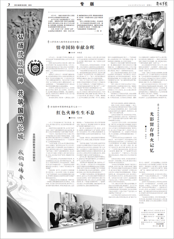 這里,讓我們將目光鎖定一位抗戰(zhàn)老兵、一位尋訪抗戰(zhàn)老兵的志愿者,以及一城爭相講述抗戰(zhàn)故事的群眾。他們的不同視角、不同故事,彰顯著一個共同的主題——“弘揚抗戰(zhàn)精神 共筑國防長城”。