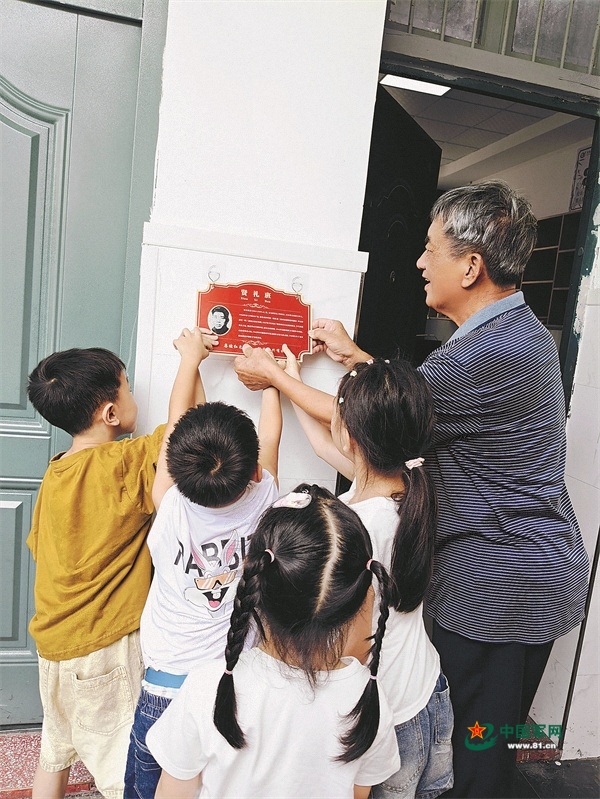 蔣賢禮烈士的兒子蔣義生,與楂林小學(xué)“賢禮班”學(xué)生一起掛“英烈牌”。季俊磊攝