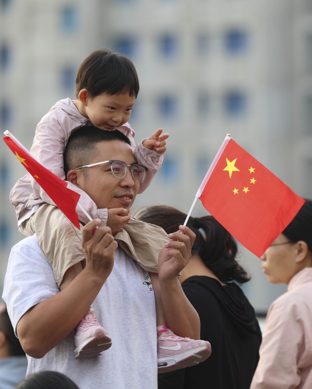 10月1日,在上海中共一大紀(jì)念館,一名小女孩坐在爸爸的肩膀上觀看升旗。