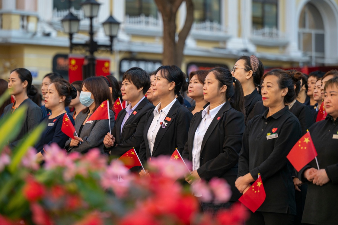 10月1日,人們?cè)诠枮I市道里區(qū)中央大街參加升旗儀式。