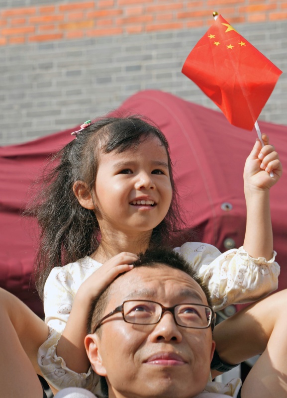 10月1日,在河北省石家莊解放廣場(chǎng),小朋友在家長陪伴下參加升旗儀式。