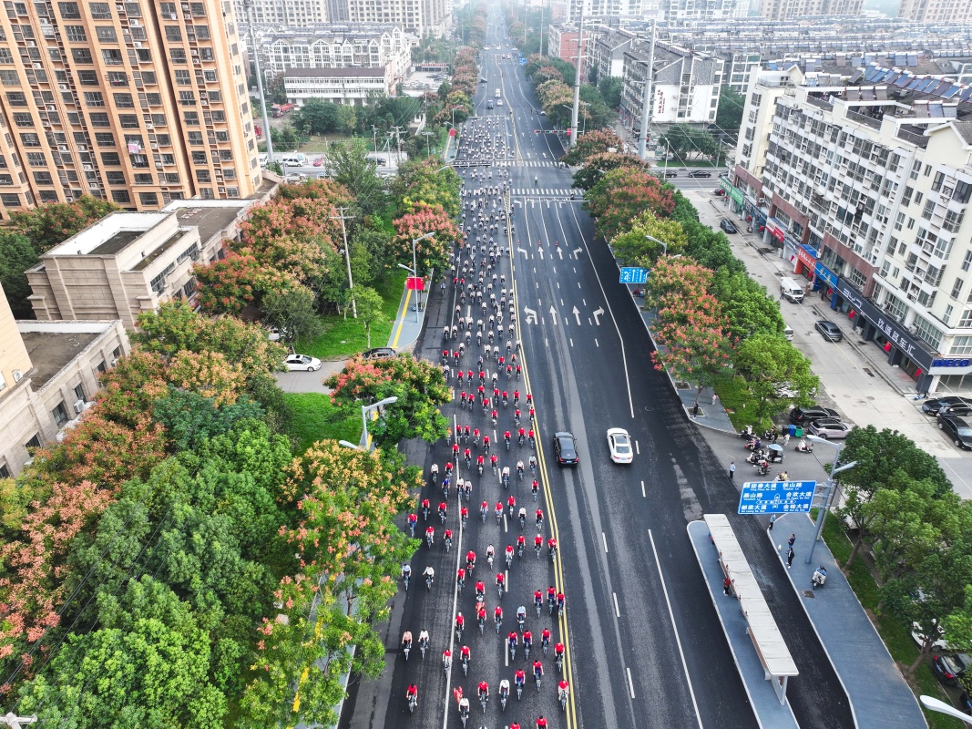 10月1日,江蘇省淮安市盱眙縣舉行“共賀祖國華誕”綠色騎行活動(dòng)(無人機(jī)照片)。