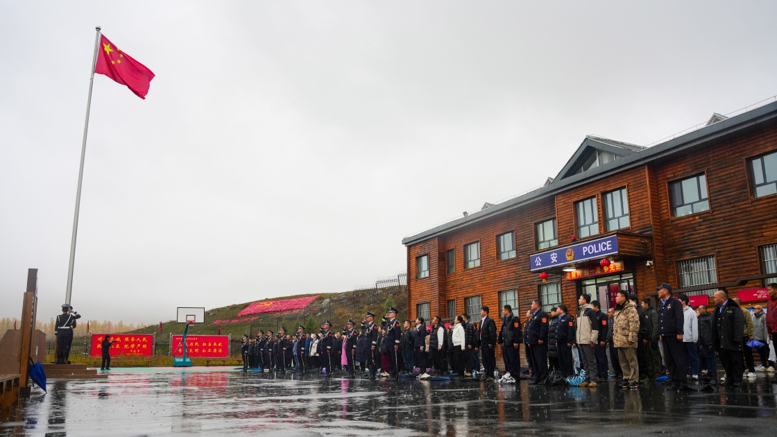 10月1日在新疆阿勒泰邊境管理支隊(duì)喀納斯邊境派出所拍攝的升旗儀式。