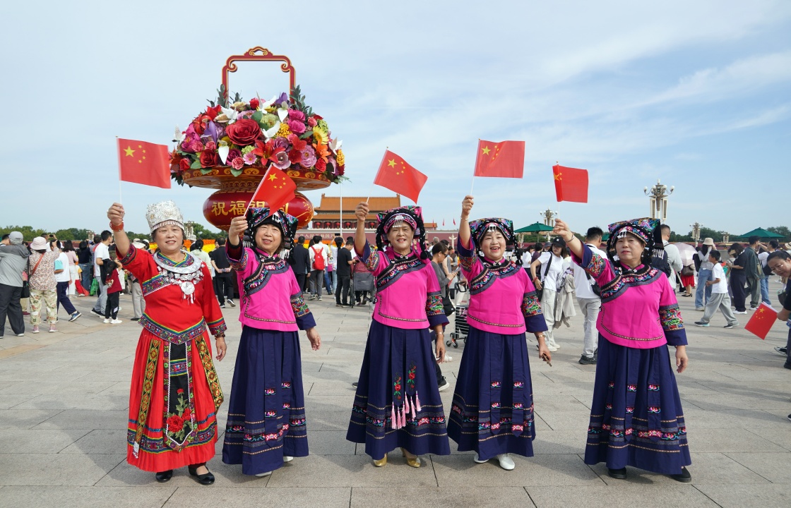 10月1日,來自貴州的布依族游客在北京天安門廣場(chǎng)游覽拍照。