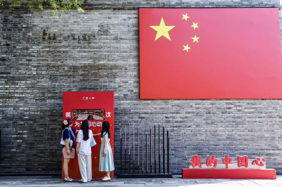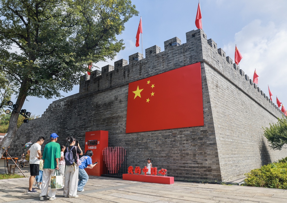 10月1日,在浙江嘉興市南湖區(qū)建設(shè)街道子城城墻邊,市民參加我為祖國心動(dòng)打卡活動(dòng)。
