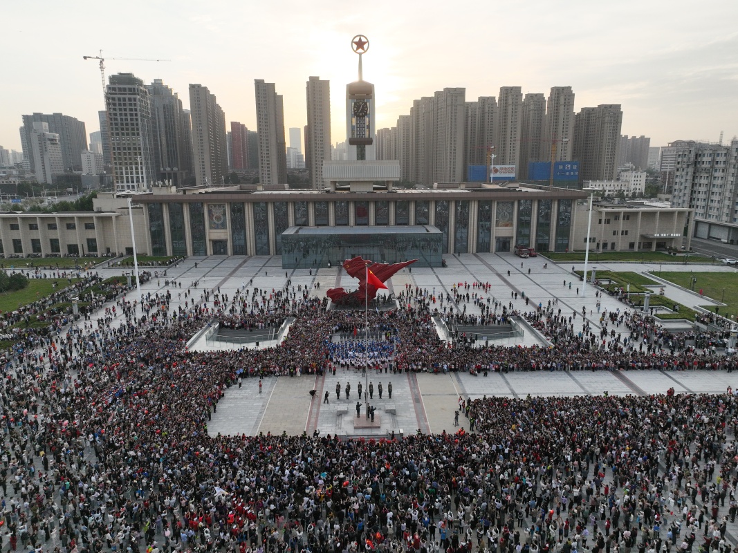 10月1日,人們?cè)诤颖笔∈仪f解放廣場(chǎng)參加升旗儀式(無人機(jī)照片)。