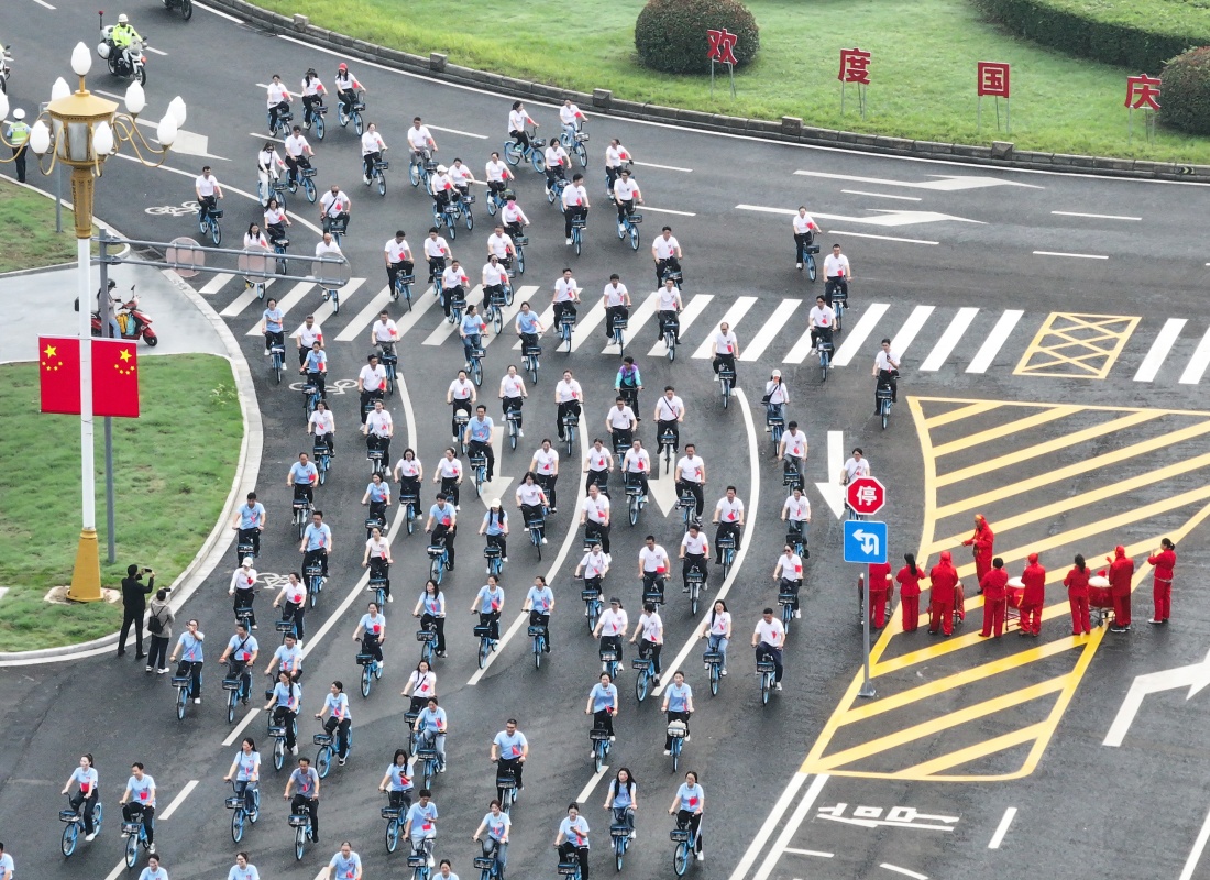 10月1日,江蘇省淮安市盱眙縣舉行“共賀祖國華誕”綠色騎行活動(dòng),參與者騎車出發(fā)。