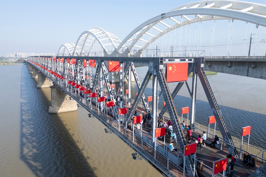 10月1日,游客在哈爾濱市濱州鐵路橋上游覽(無人機(jī)照片)。