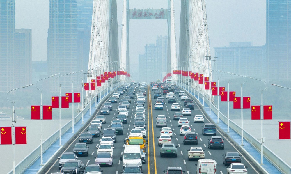 國慶假期第一天,各地迎來出行高峰。這是車輛行駛在湖北省武漢長江二橋上(無人機(jī)照片,10月1日攝)。新華社記者肖藝九攝