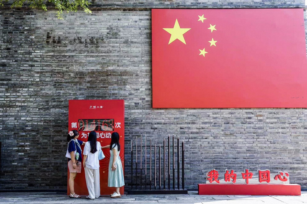 10月1日,在浙江嘉興市南湖區(qū)建設(shè)街道子城城墻邊,市民參加我為祖國心動(dòng)打卡活動(dòng)。新華社記者徐昱攝
