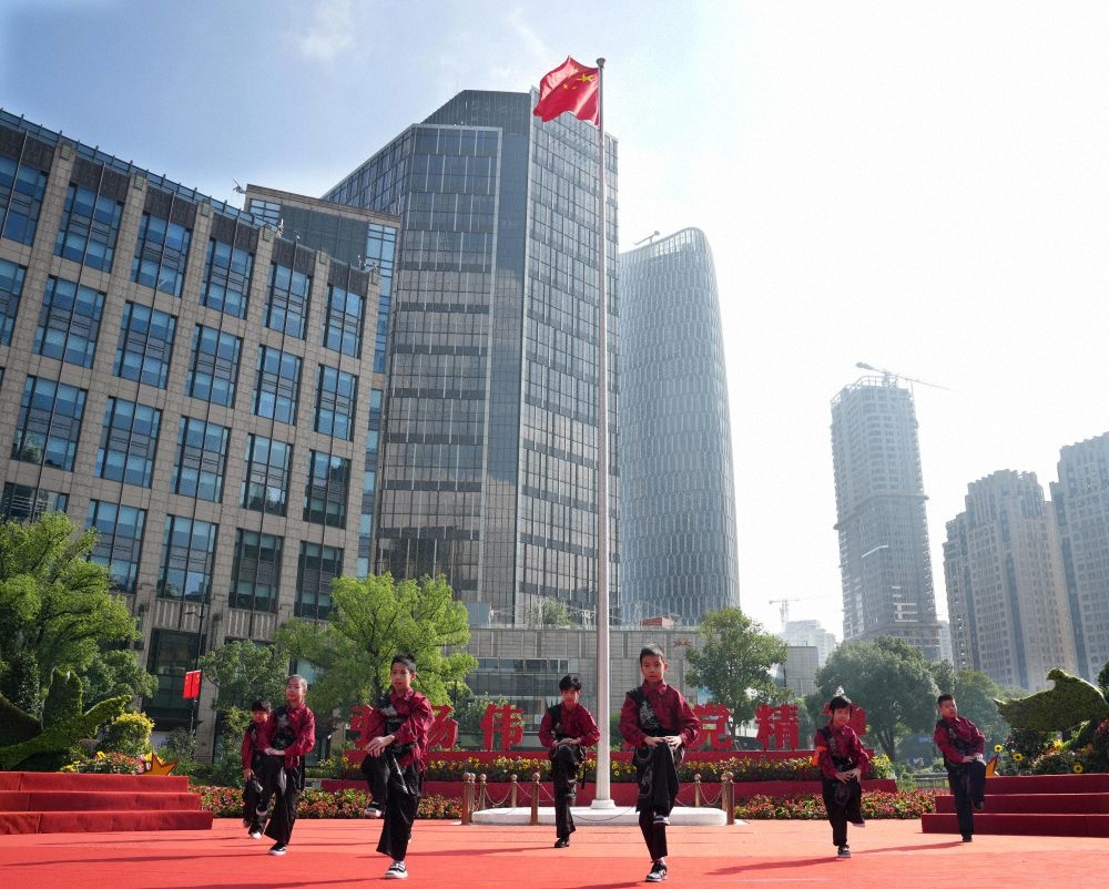 10月1日,在上海中共一大紀(jì)念館前舉行的文藝演出中,小朋友在表演舞蹈《男兒當(dāng)自強(qiáng)》。新華社記者劉穎攝