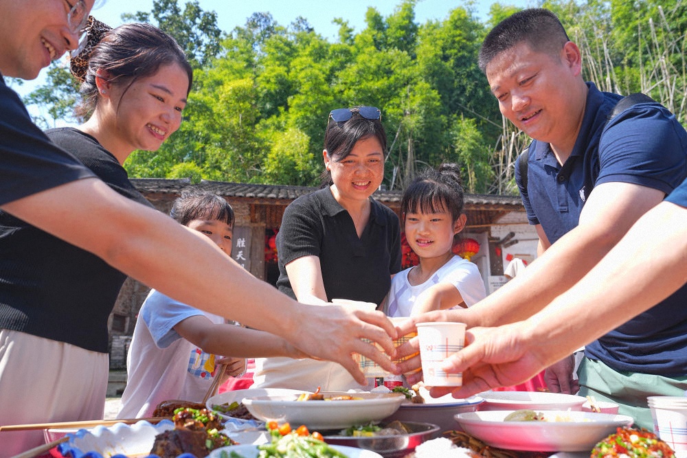 10月6日,在重慶市北碚區(qū)金刀峽鎮(zhèn)勝天湖村“九斗碗壩壩席”現(xiàn)場,游客舉杯共慶中秋佳節(jié)。新華社發(fā)(秦廷富攝)