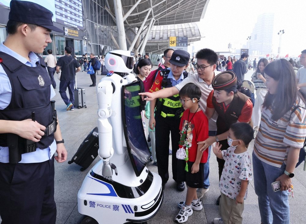 10月1日,在湖北省武漢站,小朋友和機(jī)器人互動(dòng)。新華社發(fā)(趙軍攝)