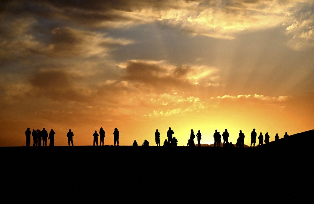 這是10月2日清晨,游客在甘肅省敦煌市鳴沙山月牙泉景區(qū)觀賞大漠日出美景。新華社發(fā)(張曉亮攝)